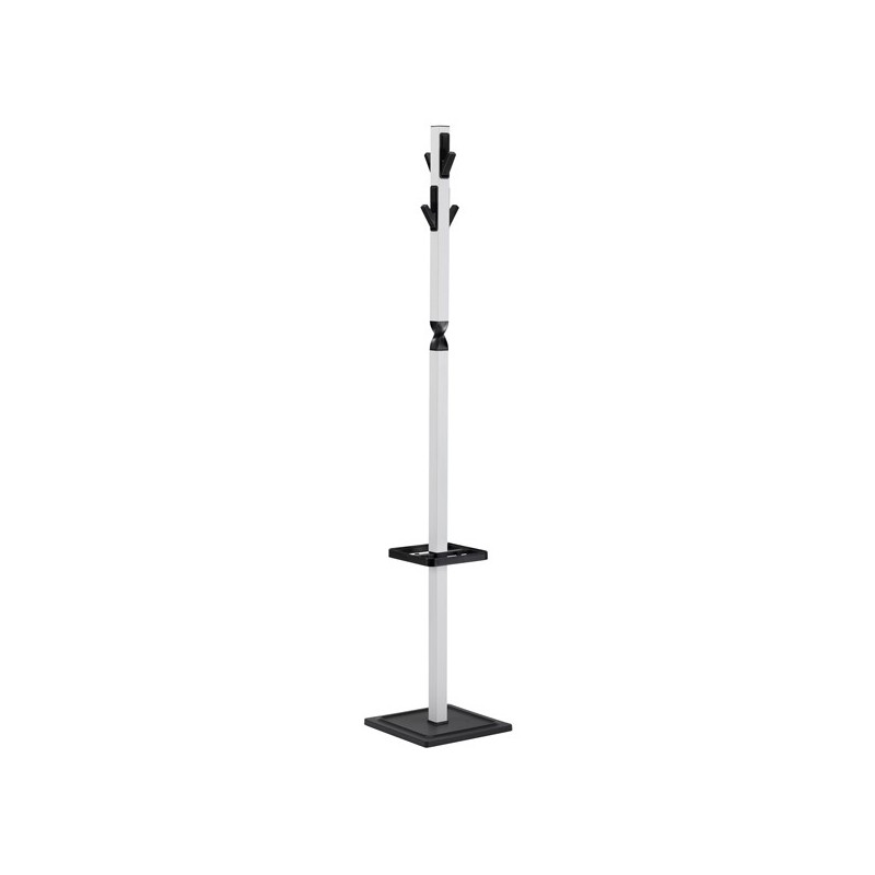 Appendiabiti in metallo verniciato con 12 ganci totali di cui 4 superiori a scomparsa, altri 4 inferiori. I ganci di appoggio fanno parte di un sistema a cappelliera in plastica in polietilene nera, la quale viene assemblata con un intelligente sistema ad incastro e fissata allo stelo principale. Lo stelo principale in metallo tubolare sezione quadra del diametro di 40 mm lato è costituito da tre elementi a innesto conico in una elegante base zavorrata in acciaio rivestita in polipropilene delle dimensioni cm 32 x 32 con parte centrale incavata con funzione raccogligocce. Vi è presente un portaombrelli ad un terzo dell’altezza della struttura con ganci portachiavi. Nella giunzione dei due steli superiori tra loro avvitabili vi si colloca un elegante coprigiunto in polietilene nero. All'interno dell'imballo tutte le parti sono protette da sacchetti in plastica contro gli urti accidentali. Altezza 175cm.