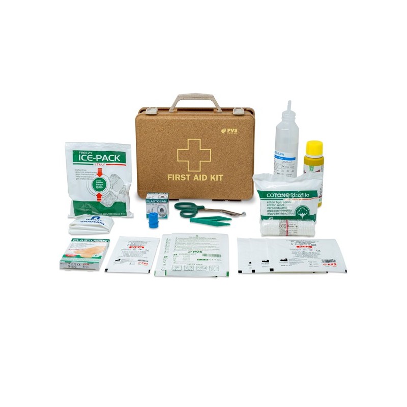 FUTURA è la prima valigetta ecosostenibile, realizzata al 100% con materiali riciclati addizionando PP/Farina di Legno (WPC-Wood Plastic Compound) con cariche vegetali tra il 30-40%. Mantiene tutte le qualità del legno, la resistenza del PP e preserva l'ambiente dall'immisione di plastiche dannose. Dotata di supporto per attacco a parete, maniglia per trasporto e chiusura con 2 clip rotanti. Dimensioni (L x P x H): 250x190x90 mm. Contenuto a norma del DM 388 del 15/07/2003 allegato 2 e D.L. 81 del 09/04/08 art.45. per aziende o unità produttive con meno di tre lavoratori che non rientrano nel gruppo A . L'art.2 punto 5 del DM 388 del 15.7.2003 prevede che il contenuto di cui all'allegato 2 deve essere fornito ai lavoratori che operano in luoghi diversi dalla sede aziendale o unità produttiva. Contenuto: 1 Copia Decreto Min 388 del 15.07.03 2 Paia guanti sterili LATEX FREE 1 Flacone disinfettante 125 ml IODOPOVIDONE al 10% iodio PMC 1 soluzione fisiologica sterile 250 ml CE 1 Busta compressa garza sterile cm 18x40 3 Buste compressa garza sterile cm 10x10 1 Pinza sterile 1 Confezione di cotone idrofilo 1 PLASTOSAN 10 cerotti assortiti 1 Rocchetto cerotto adesivo m 5x2,5 cm 1 Benda di garza da m 3,5x10 cm 1 Paio di forbici cm 10 1 Laccio emostatico LATEX FREE 1 ICE PACK ghiaccio istantaneo monouso 1 Sacchetto per rifiuti sanitari mm 250x350