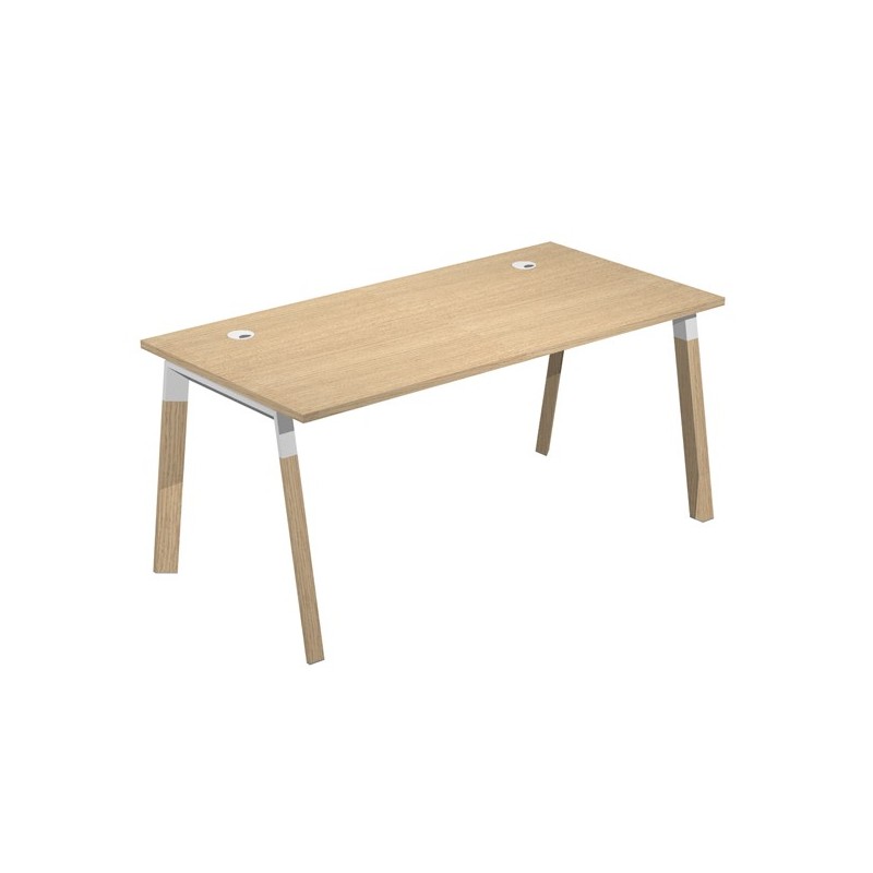 Scrivania con gambe bimateriale in metallo e legno massello. Spessore 25mm. Con due anelli passacavi diam. 80mm. Dimensioni: 120x80x72,5cm. Piano rovere.