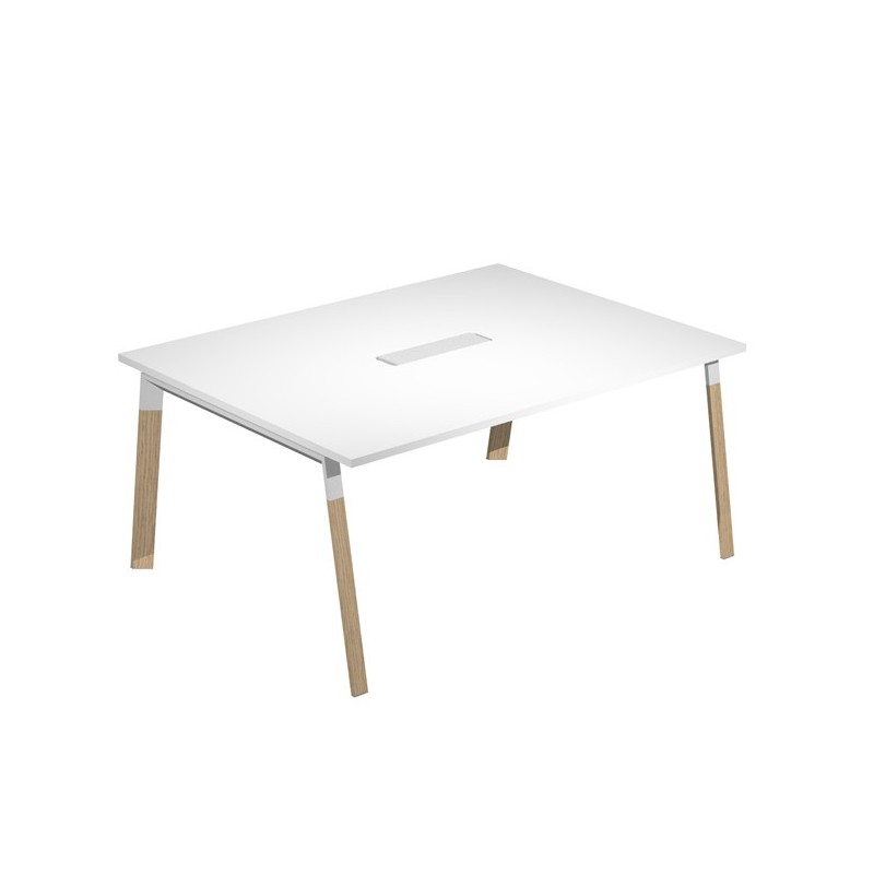Tavolo riunione completo di eco-pass con marsupio per il passaggio dei cavi. Gambe bimateriale metallo e legno massello. Dimensioni: 160x120x72,5cm. Spessore 25mm. Piano bianco.