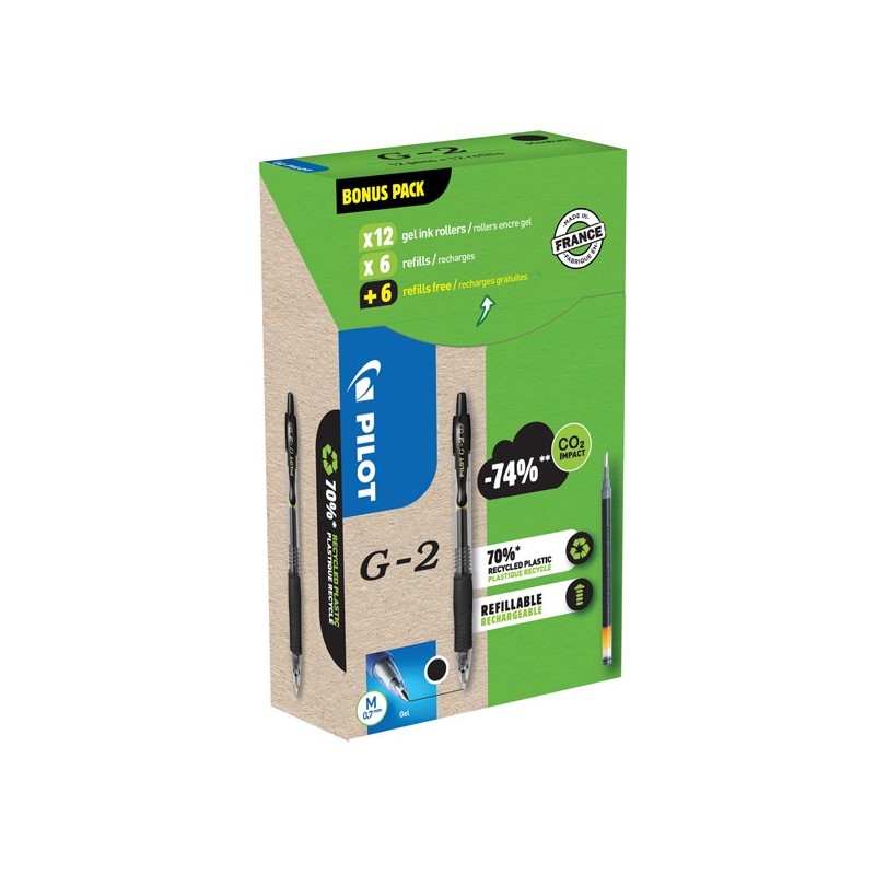 Green pack 12 penne + 12 refill roller ricaricabile con meccanismo a scatto. Inchiostro gel antisbavature resistente all’acqua. Fusto trasparente. Grip ergonomico. Clip e grip nel colore dell’inchiostro.