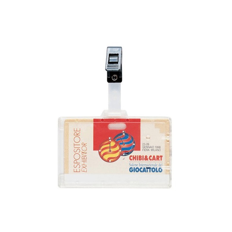 Portanome in pvc trasparente. apertura sul lato superiore. Clip in plastica nera. Non comprende il cartoncino. f.to esterno: 95x64mm. f.to interno: 90x60mm. Made in Italy