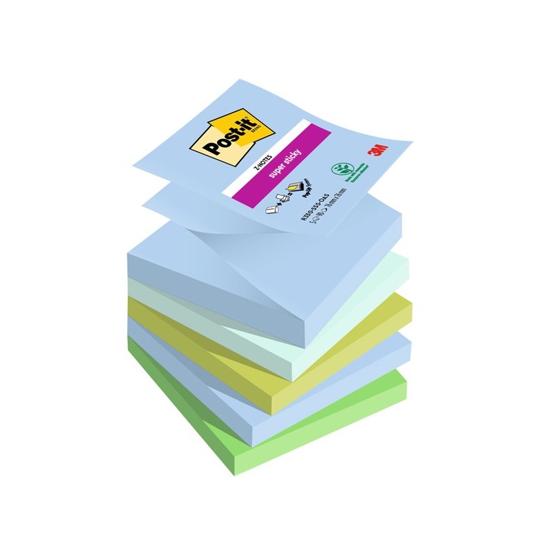 Blocchetti da 90 foglietti riposizionabili. Grazie all'adesivo rinforzato si attaccano praticamente su tutte le superfici e non lasciano traccia. Ideali per superfici difficili o verticali. Incollatura a fisarmonica, un foglietto tira l'altro, utilizzabili con uno dei tanti dispenser per foglietti Post-it Z-Notes. Formato 76x76mm. Colori Oasis: blu jeans, verde menta, verde lime, verde trifoglio, verde cristallo di mare