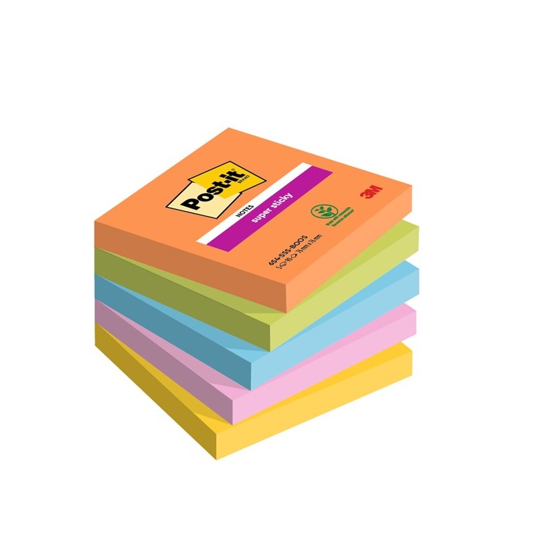 Foglietti Post-it® Super Sticky Boost: arancio acceso, verde lime, blu paradiso, rosa tropicale, giallo sole.