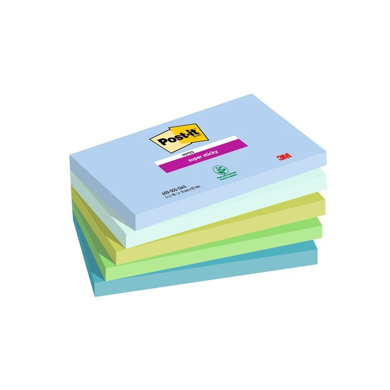 Foglietti Post-it® Super Sticky Oasis: blu jeans, verde menta, verde lime, verde trifoglio, verde cristallo di mare.