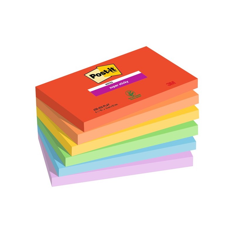 Foglietti Post-it® Super Sticky Playful: rosso candy, arancio acceso, giallo sole, verde trifoglio, blu paradiso, violetto.