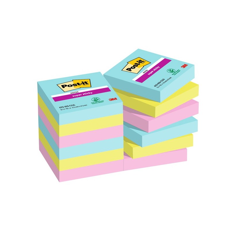 Blocchetti da 90 foglietti riposizionabili assortiti nei colori speziati. Grazie all'adesivo rinforzato si attaccano praticament su tutte le superfici e non lasciano traccia. Ideali per superfici difficili o verticali. Formato 47,6 x 47,6mm. Colore Cosmic: acqua, verde acido, rosa tropicale. Nuove confezioni in cartoncino riciclato.