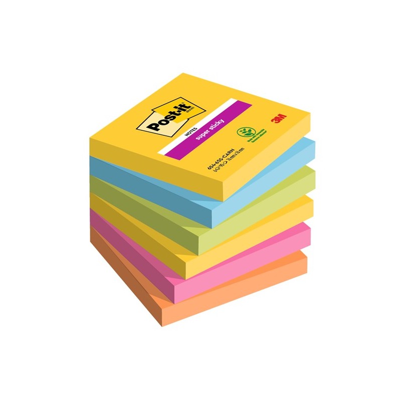Foglietti Post-it® Super Sticky Carnival: giallo sole, blu paradiso, verde lime, rosa power, arancio acceso.