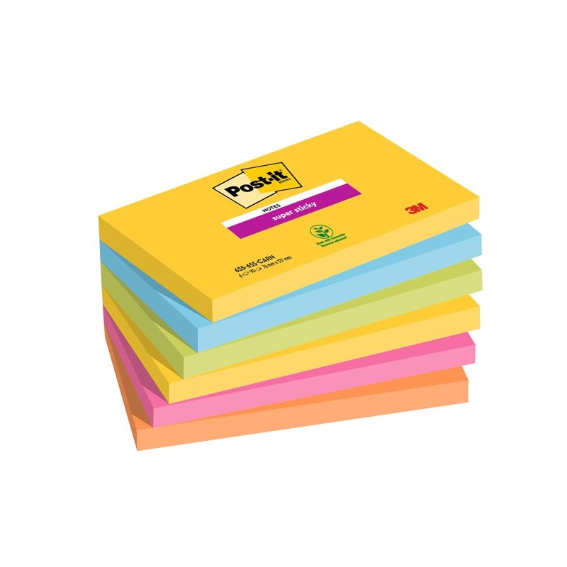 Foglietti Post-it® Super Sticky Carnival: giallo sole, blu paradiso, verde lime, rosa power, arancio acceso.