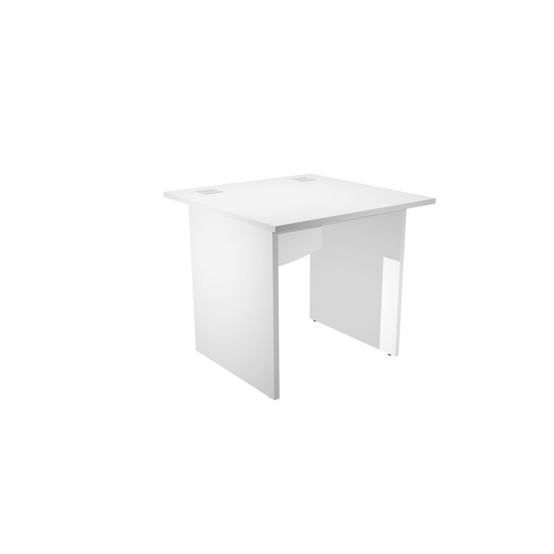 Scrivania con fianchi melaminico. Desktop completo di due anelli passacavi Bordo antiurto in ABS 2mm, piedini regolabili in altezza. Spessore 25mm.