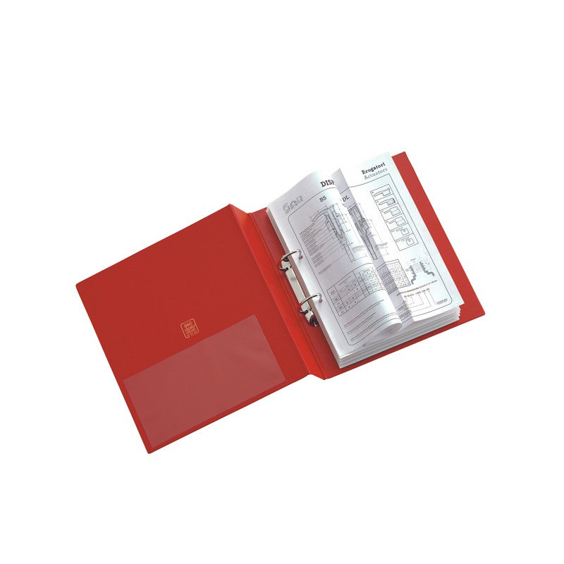 Raccoglitore in Colpan® (cartone rivestito in PVC) con meccanismo a 2 anelli (a D) e tasca interna trasparente. Ideale per archiviare qualsiasi tipo di documento. Formato esterno: 285x310 mm. Formato contenuto: 220x300 mm (A4). Dorso: 75 mm. Diametro anelli: 50 mm. Colore rosso.