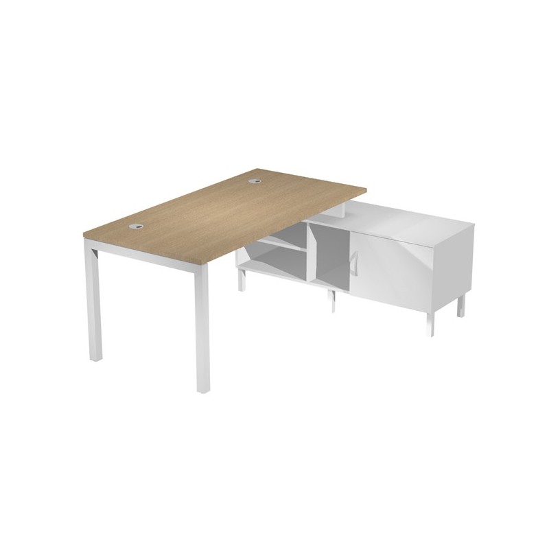 Scrivania con mobile di servizio portante (reversibile destro e sinistro). Gambe in metallo bianche a sezione quadrata 50x50 mm. Desktop con due anelli passacavi diam. 80 mm. Dimensioni complessive:L185 x P288 x H72,5 cm Dimensioni desktop:160x80cmxH72,5cm