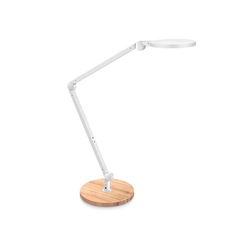 Lampada Led ideale per lo smartworking. Base in legno ideale per creare un'atmosfera calda a casa o in ufficio. Braccio con 3 giunti. Funzionale