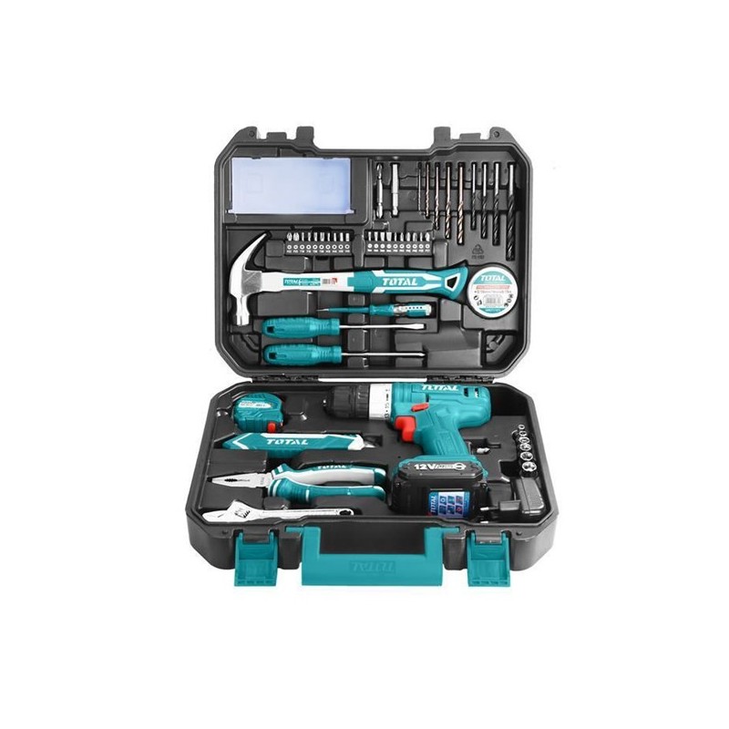 Valigetta composta da: Trapano Avvitatore 12V; 1 batteria 12V 1.5Ah; 1 Caricabatterie (tempo di carica 2 ore); 1 punta Cr-V da 65mm; 1 Adattatore 4-6mm (25mm); 6 chiavi esagonali 1/4? da 5mm, 6mm, 8mm, 9mm, 10mm, 11mm. ; 1 Martello; 1 cacciavite SL5.5*100; 1 cacciavite PH1*100; 1 pinza combinata da 7"; 1 chiave regolabile da 6"; 1 cacciavite cercafase AC: 100-500V; 1 Flessometro in acciaio da 3m; 1 taglierino; 5 punte da muro da 2mm, 3mm, 4mm, 5mm, 6mm; 4 punte per legno da 4mm, 5mm, 6mm, 8mm; 1 nastro isolante 0.19mm*18mm*9.15m; 1 adattatore magnetico per punte; 20 punte per avvitatore: SL3, SL4, SL5, SL6, PH0, PH1, PH2, PH3, PZ0, PZ1, PZ2, PZ3, T10, T15, T20, T30, H3, H4, H5, H6; 40 viti: 25 pezzi da ST3.5, 10 pezzi da ST4, 5 pezzi da ST5; 40 tasselli in plastica: 25 da 5mm, 10 da 6mm, 5 da 8mm.