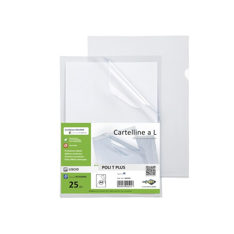 Cartelline in PP liscio trasparente, altissimo spessore, con apertura a L e una lunetta laterale per un efficace inserimento o estrazione dei fogli. Ideale per archiviare fotocopie, fax, documenti.