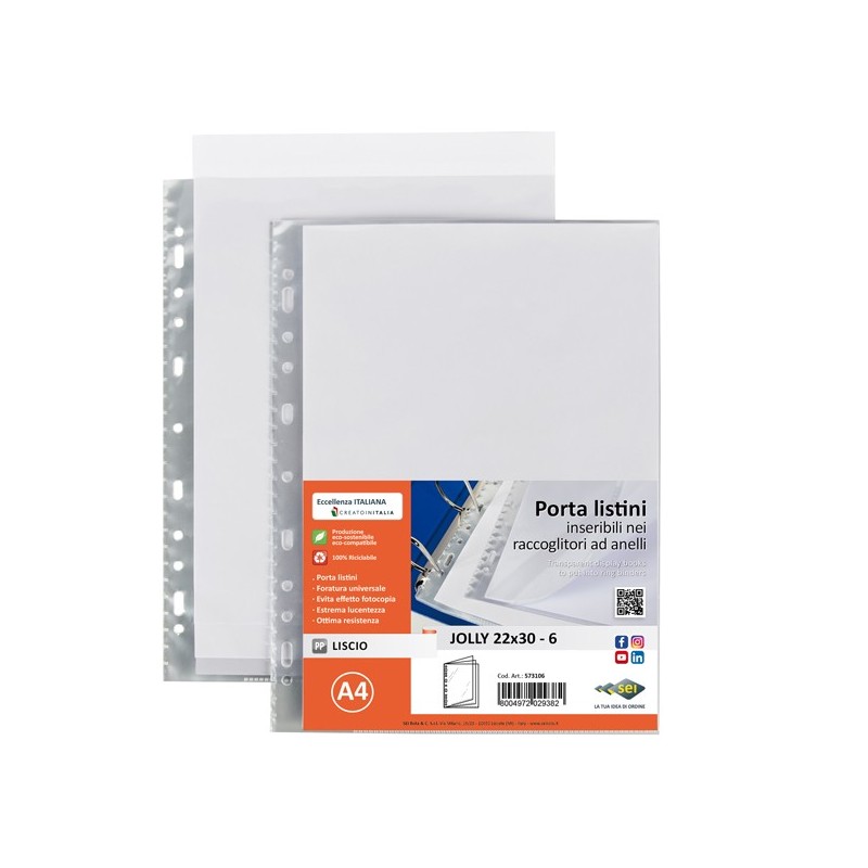 Porta listini trasparenti a fogli fissi con foratura universale in PP liscio. Inseribili in tutti i raccoglitori ad anelli. Disponibili a 6 buste (12 facciate) e a 12 buste (24 facciate). F.to 22x30cm