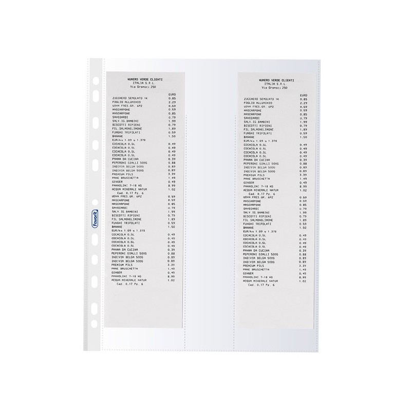 Buste a foratura porta scontrini fiscali realizzate in polipropilene con finitura buccia d’arancia anti-riflesso. 3 strati con foratura e banda rinforzata. Contengono 3+3 tasche per scontrini larghi 7 cm. o 2+2 tasche per scontrini di 8 cm. Tasche con apertura dall’alto e spessore medio con un’ottima resistenza. Made in Italy.
