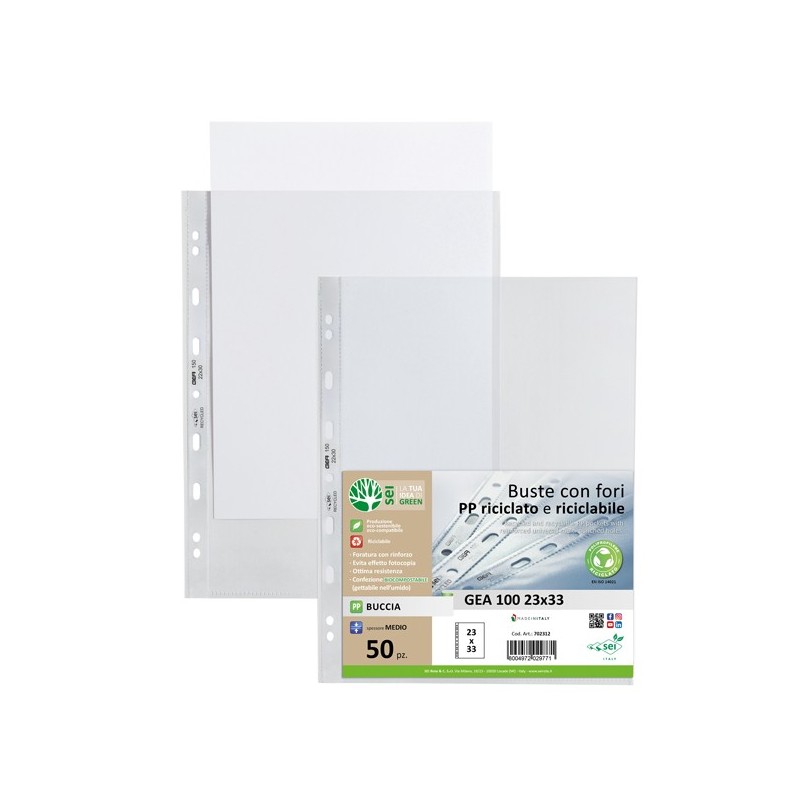 Buste in PP buccia, riciclato e riciclabile, con foratura universale rinforzata. Spessori alto, medio. Confezione compostabile al 100%. Ideali per archiviare qualsiasi tipo di documento, con un particolare pensiero alla sostenibilità.