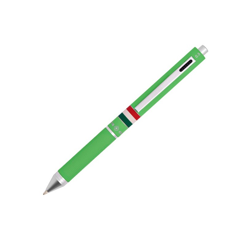 Penna a sfera multifunzione in metallo satinato/gommato con bandiera Italia. Punta a sfera nero, blu, rosso e portamine da 0,5 mm. Confezione in tubo di alluminio.