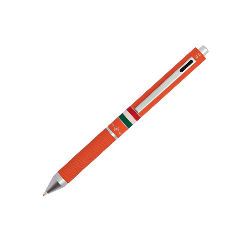 Penna a sfera multifunzione in metallo satinato/gommato con bandiera Italia. Punta a sfera nero, blu, rosso e portamine da 0,5 mm. Confezione in tubo di alluminio.