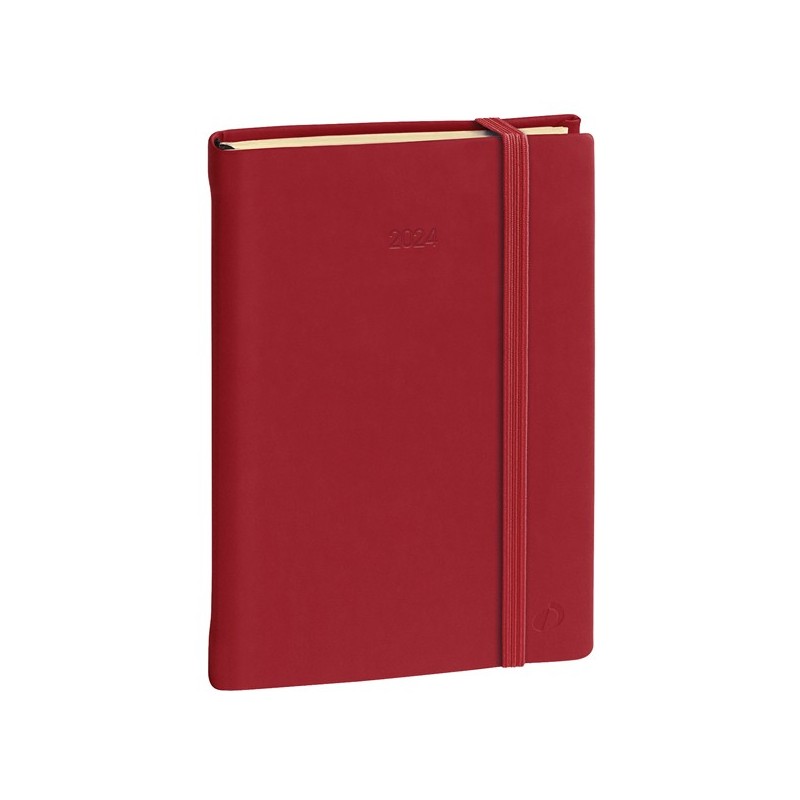 Agenda giornaliera tascabile, un giorno per pagina. 12 mesi da gennaio a dicembre, schema multilingue e rubrica intercambiabile, tasca con soffietto portabiglietti. Carta color avorio certificata PEFC stampa bicolore, rilegatura cucita e chiusura con elastico.