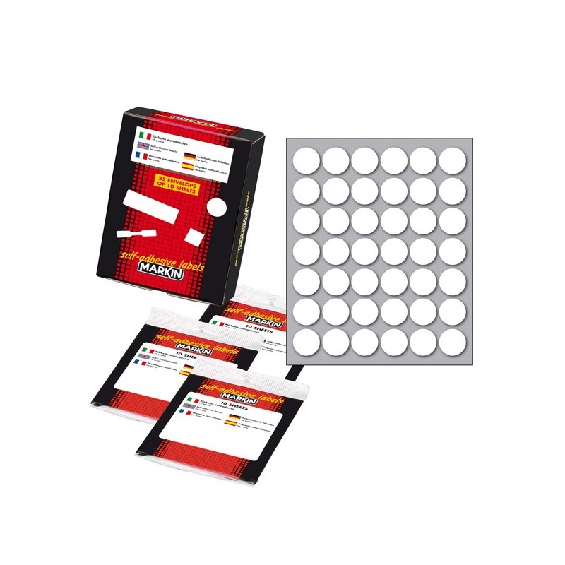Busta da 10 fogli formato 125x152.5mm di etichette bianche permanenti. Ogni foglio contiene 42 etichette tonde da 18mm.