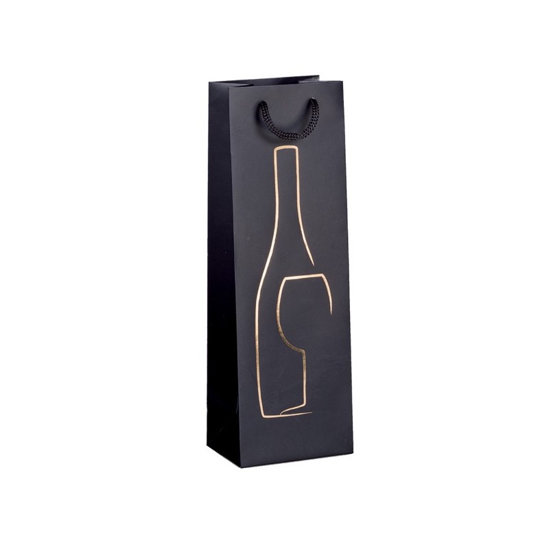 Shopper portabottiglie in carta patinata 190 g/m2. Dotato di manici in corda. Stampa oro a caldo.