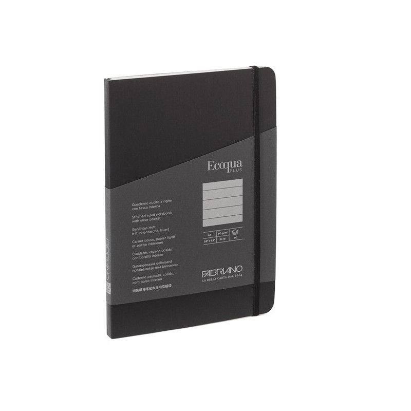 Taccuino EcoQua Plus - con elastico - rilegatura cucita - A5 - 5 mm - 80 fogli - righe - nero - Fabriano