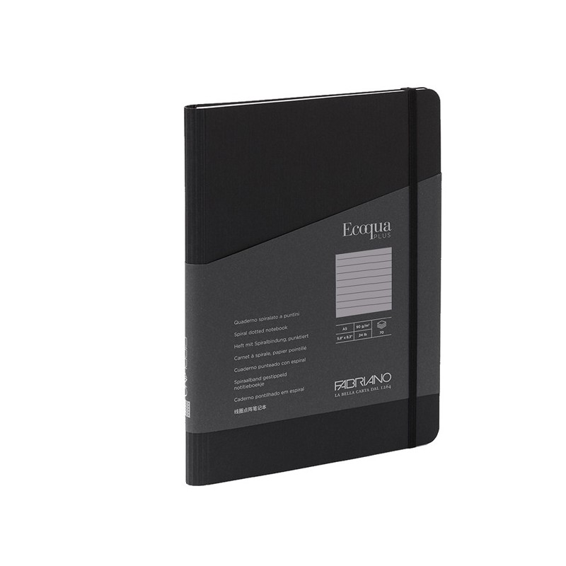 Taccuino EcoQua Plus - con elastico - spiralato - A5 - 70 fogli - righe - nero - Fabriano