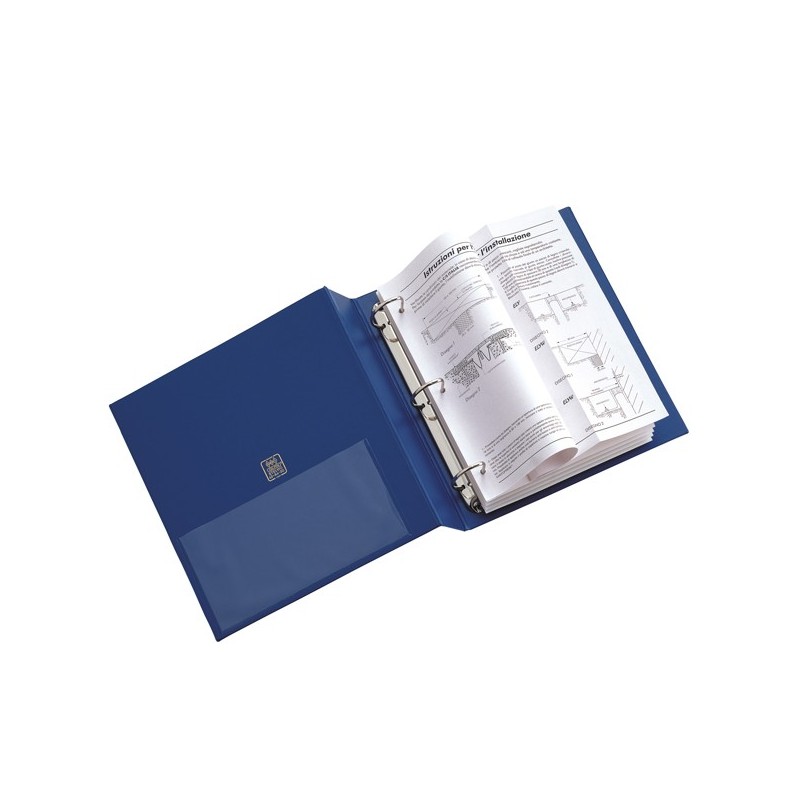 Raccoglitore in Colpan® (cartone rivestito in PVC) con meccanismo a 3 anelli (a D) e tasca interna trasparente. Ideale per archiviare manuali e documenti di ogni tipo. Formato esterno: 280x310 mm. Formato contenuto: 220x300 mm (A4). Dorso: 55 mm. Diametro anelli: 40 mm. Passo: 11 cm. Colore blu.