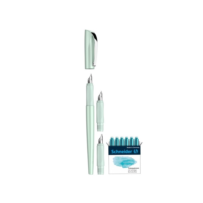 Penna stilografica calligrafica con elegante look metalizzato, impugnatura ergonomica gommata. Utilizzabile con cartucce standard o converter. Confezione regalo contenente: 1 stilo con 3 punte intercambiabili (1,1 - 1,5 - 1,8mm). Incluso nella confezione 6 cartucce ricambio.