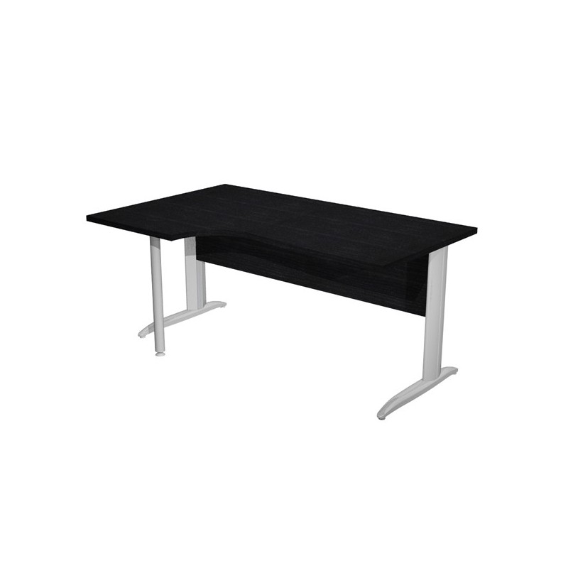 Scrivania compact sinistro sagomata con fianchi metal ad L verniciati effetto cromo. Spessore 22mm. Completi di canalina passacavi e piedini regolabili in altezza e supporto metal. Desktop con bordo anti urto in ABS da 2mm. Dimensioni: 160x60/80/100x72cm. Piano nero venato frassino.