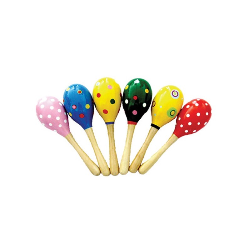 Coppia di maracas in legno con decorazioni colorate. Dimensioni: 20x5,5cm.