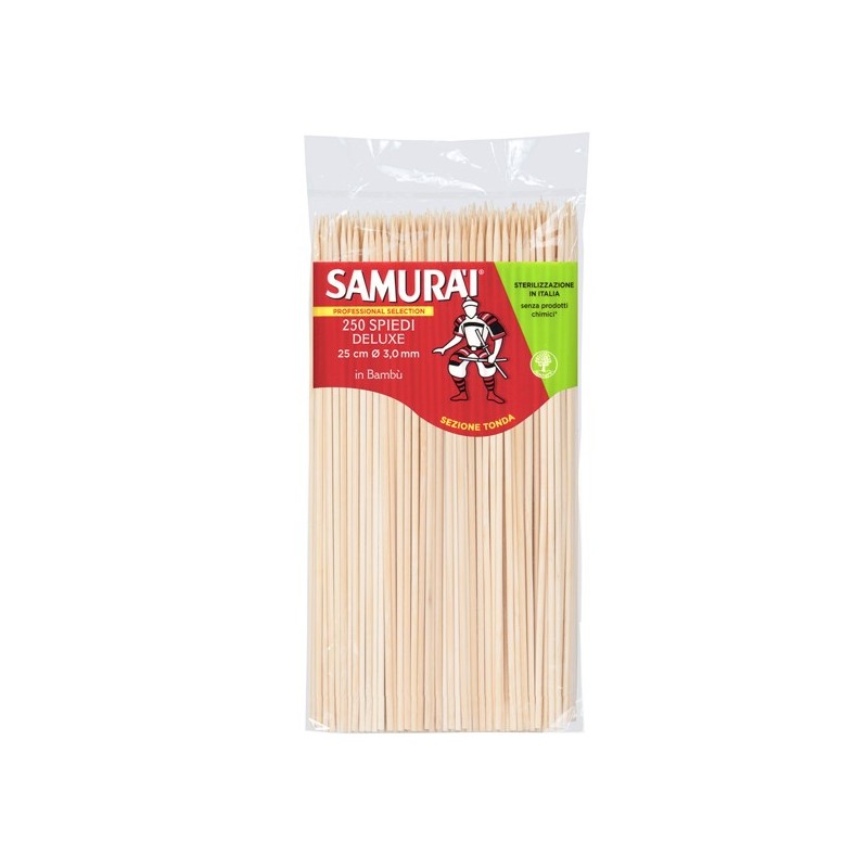 Gli Spiedi Deluxe Samurai sono naturali al 100% perché interamente realizzati in bambù, che conferisce allo spiedo una particolare resistenza che lo rende adatto anche per le preparazioni a più alte temperature. Dimensioni: 25cm-?3,0mm