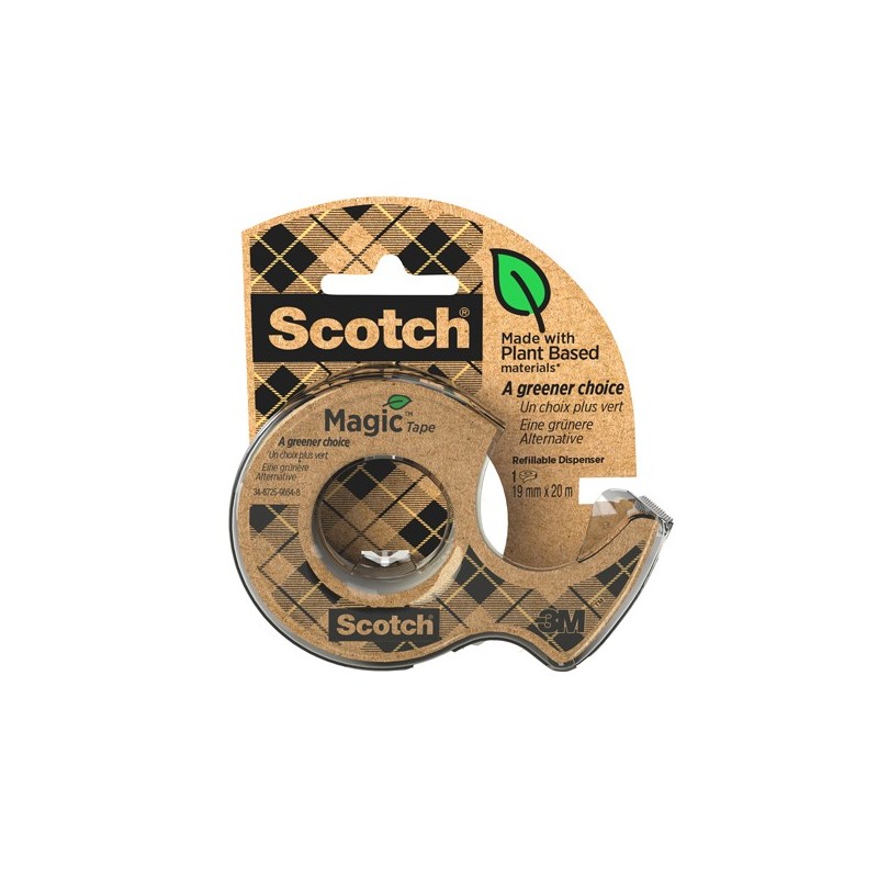 Dispenser in matateriale riciclato contenente 1 rotolo di nastro adesivo Scotch® Magic™ 900 Green: Nastro adesivo 19mmx20m invisibile permanente, supporto in acetato di cellulosa, adesivo di origine vegetale, anima in cartoncino riciclato al 100%, pack in cartoncino.