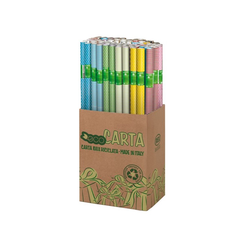 Scatola espositore con 50 rotoli di carta regalo patinata da 65gr in fantasie assortite. Dimensioni 2mt x 70cm.