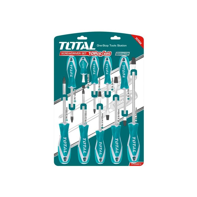 Set da 10 cacciaviti; Materiale: Cr-V; Misure: SL3.0*3*75, SL4.0*4*100, SL5.5*5*125, SL6.5*6*150, SL8.0*8*200, SL6.5*6*38, PH0*3*60, PH1*5*80, PH2*6*100, PH3*8*150
