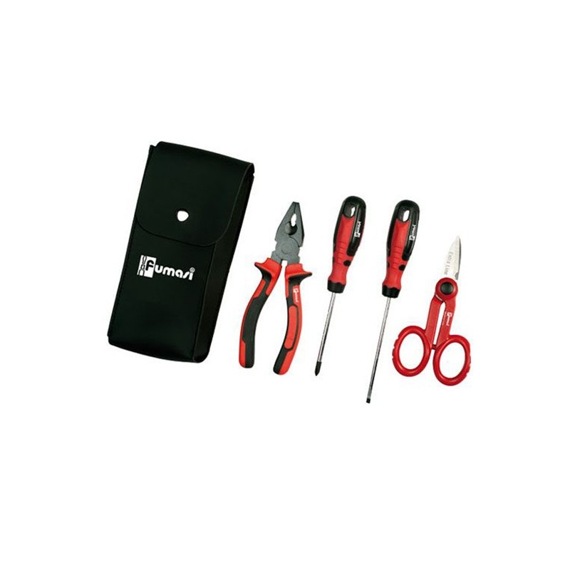 Trousse in similpelle composta da: n°1 pz forbice per elettricisti lama diritta micro-dentata 145 mm; n°1 pz pinza universale in acciaio cromo-vanadio brunita nera 160 mm; n°1 pz cacciavite punta piatta 4.0x100 mm; n°1 pz cacciavite punta phillips 1x80 mm