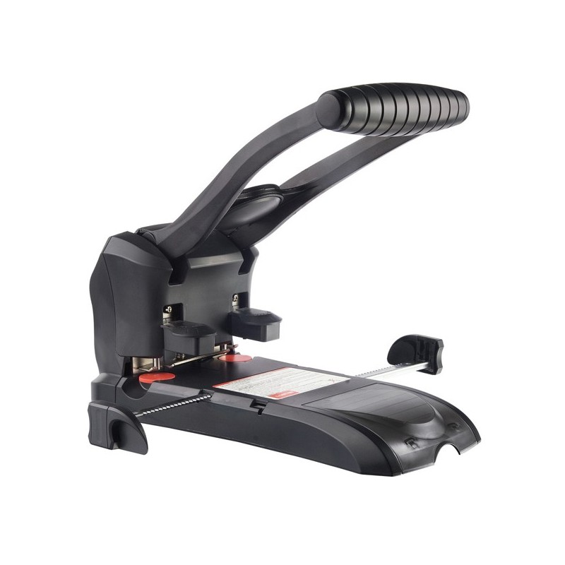 Perforatore a 2 fori per alti spessori in metallo verniciato con guida regolabile e comoda impugnatura rivestita in materiale antiscivolo.