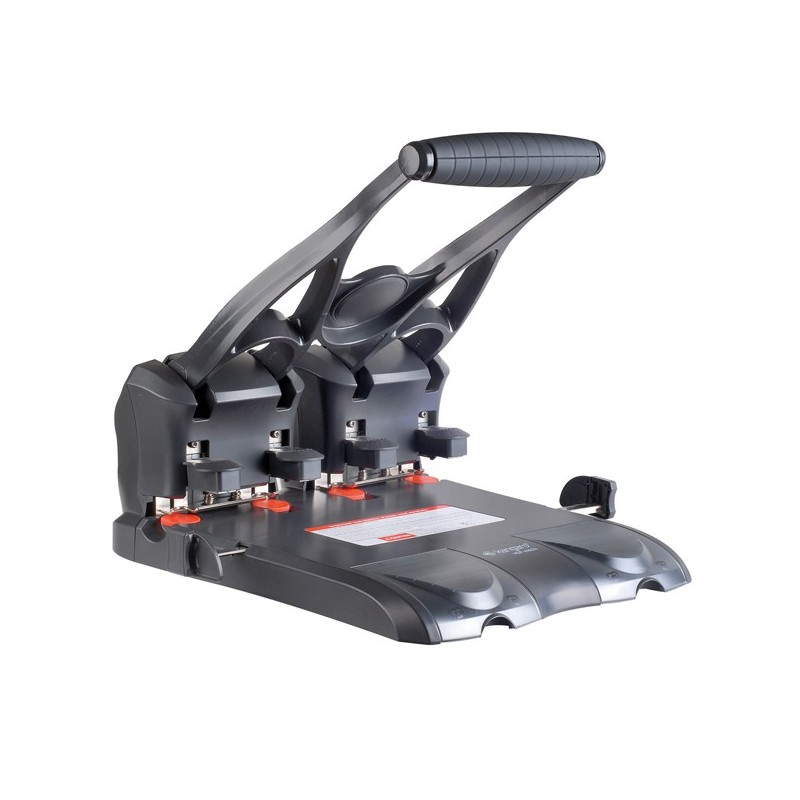 Perforatore a 4 fori per alti spessori in metallo verniciato con guida regolabile e comoda impugnatura rivestita in materiale antiscivolo.