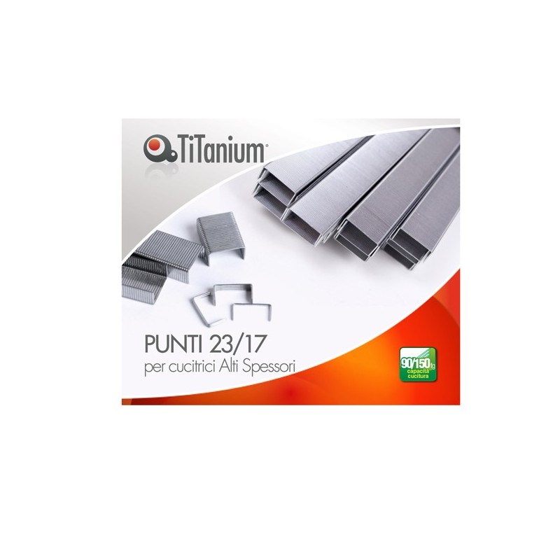Punti metallici per alti spessori di alta qualità in acciaio zinco-cromato. Cucitrice utilizzabile: idonee per passo 23 Capacità di cucitura: 90-150fg Scatola da 1000 punti