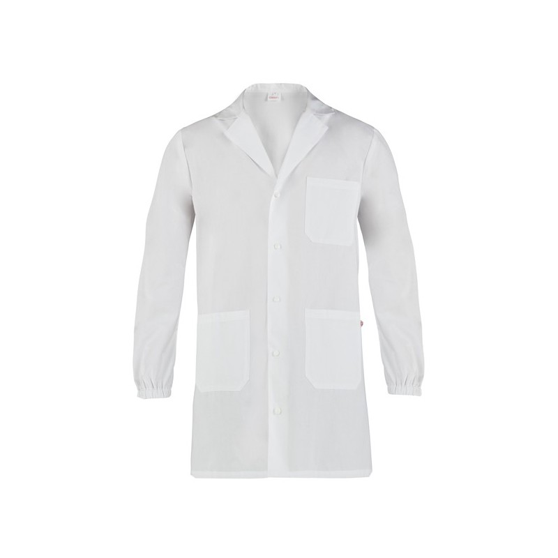 Camice ospedaliero da uomo con un taschino applicato al petto sinistro e due tasche inferiori. Chiusura centrale con automatici. 100% cotone. Polsi elasticizzati. Taglie disponibili: da XS a 4XL. Regualr Fit.