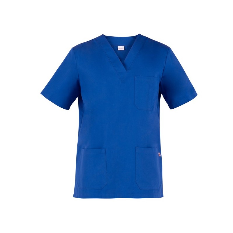 Casacca 100% cotone a maniche corte. Con un taschino applicato al petto sinistro e due tasche inferiori, 2 spacchetti laterali. Ideale per abiente ospedaliero. Taglie disponibili: da XS -4XL. Slim Fit.