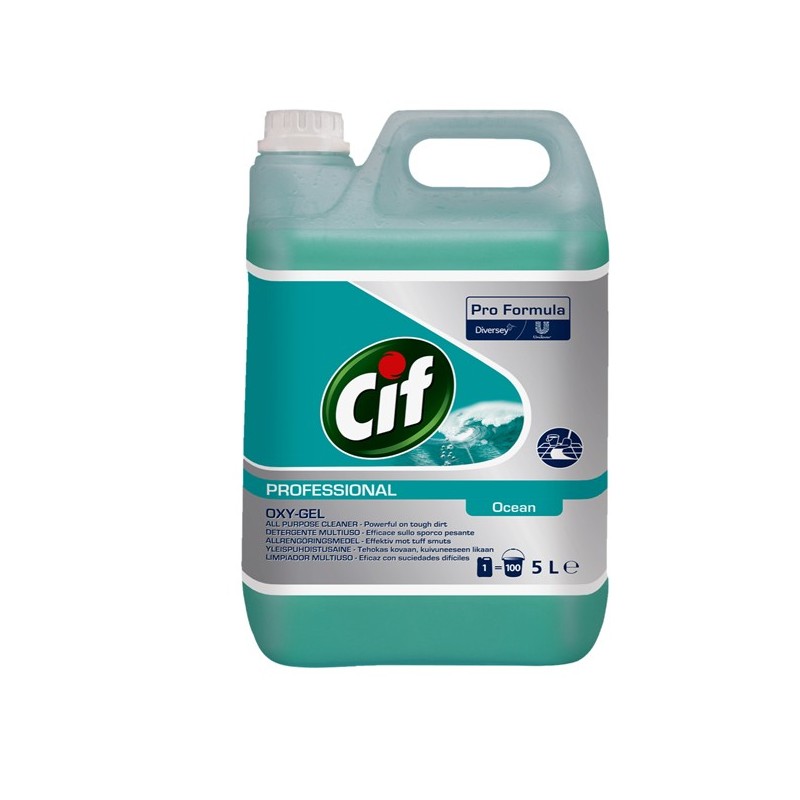 Gel con ossigeno attivo per i paviementi e tutte le superfici lavabili. Cif Oxy-Gel Professionale sviluppa microbollicine che aiutano a sollevare lo sporco mentre il gel lo rimuove velocemente e a fondo. Non necessita di risciacquo. Gradevole profumazione. Modalità d’uso: Uso diluito: per pulire i pavimenti e le grandi superfici, versare 20 ml di Cif Oxy-Gel Professionale per ogni litro d’acqua. Il gel si dissolve immediatamente nell’acqua. Non occorre risciacquare. Dosaggi consigliati: 80-160 ml di prodotto in 8 litri d’acqua a seconda del grado di sporco. Uso puro: per lo sporco difficile di bagno e cucina, versare Cif Oxy-Gel Professionale direttamente sulla superficie, lasciare agire per qualche istante e risciacquare con un panno umido.