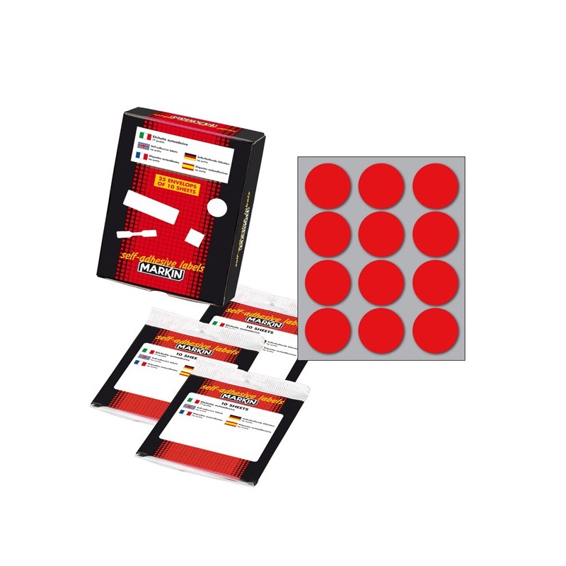 Busta da 10 fogli formato 125x152.5mm di etichette rosso permanenti. Ogni foglio contiene 12 etichette tonde da 34mm.