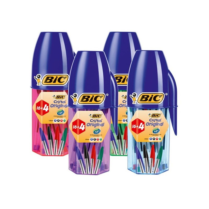 Un assortimento completo di penne a sfera Cristal Original con punta media da 1mm in un iconico astuccio riutilizzabile, anche come portapenne da scrivania. Prodotto certificato ecologicamente NF Environment. Assortimento in 4 colori: 8 nero, 6 blu, 4 rosso e 2 verde.