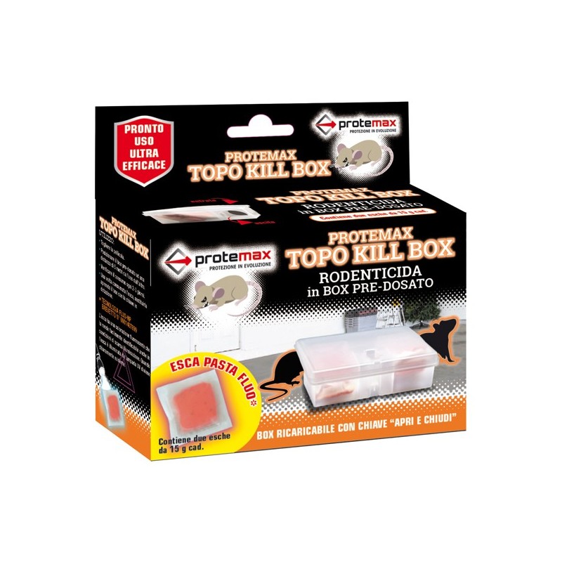 Box predosato con esca peer topi altamente appetibile ed efficace. Esca rodenticida in pasta fluo inserita in un contenitore di sicurezza in plastica trasparente, dotato di chiave per l’apertura e chiusura. Una volta consumata l’esca il contenitore può essere utilizzato per successivi trattamenti reintegrando l’esca topicida. Indicato per: il controllo del Topo domestico (Mus musculus). Uso all’interno degli edifici. Principio attivo: Brodifacoum puro (N° CAS 56073–10–0) 0,0029%. Registrazione: PROTEMAX TOPO KILL BOX Autorizzazione biocida n° IT/2018/00490/MRS DI LIBERA VENDITA. Dimensioni:13x9x4 h cm diam. foro entrata 2,5 cm.
