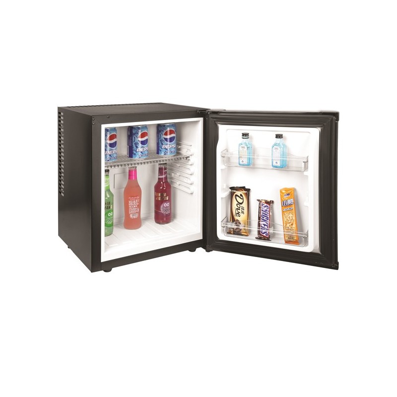 Minibar per hotel ad elevata efficienza energetica ( Livello energetico F; ex classe A+), da incasso o libera installazione. Innovativo sistema di raffreddamento termoelettrico, basato su una pompa di calore a stato solido (cella di Peltier). Completamente silenziosi (zero db) ed ecologici (assenza di ammoniaca). Dimensione esterne A x L x P: 475 x 385 x 455 mm
