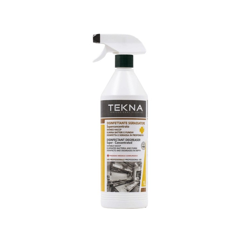 Disinfettante sgrassatore, superconcentrato, non profumato con trigger. Certificazione presidio Medico chirurgico e Haccp. Potente sgrassatore battericida e fungicida ideale per forni e fornelli, lavandini, cellle frigo, piani di lavoro e ogni superficie che va a contatto con gli alimenti. Sgrassa e disinfetta contemporaneamente superfici, accessori e parti meccaniche in acciaio, plastica, marmo e ceramica. Biodegradabile, non contiene fosfati e non è tossico per la flora acquatica.