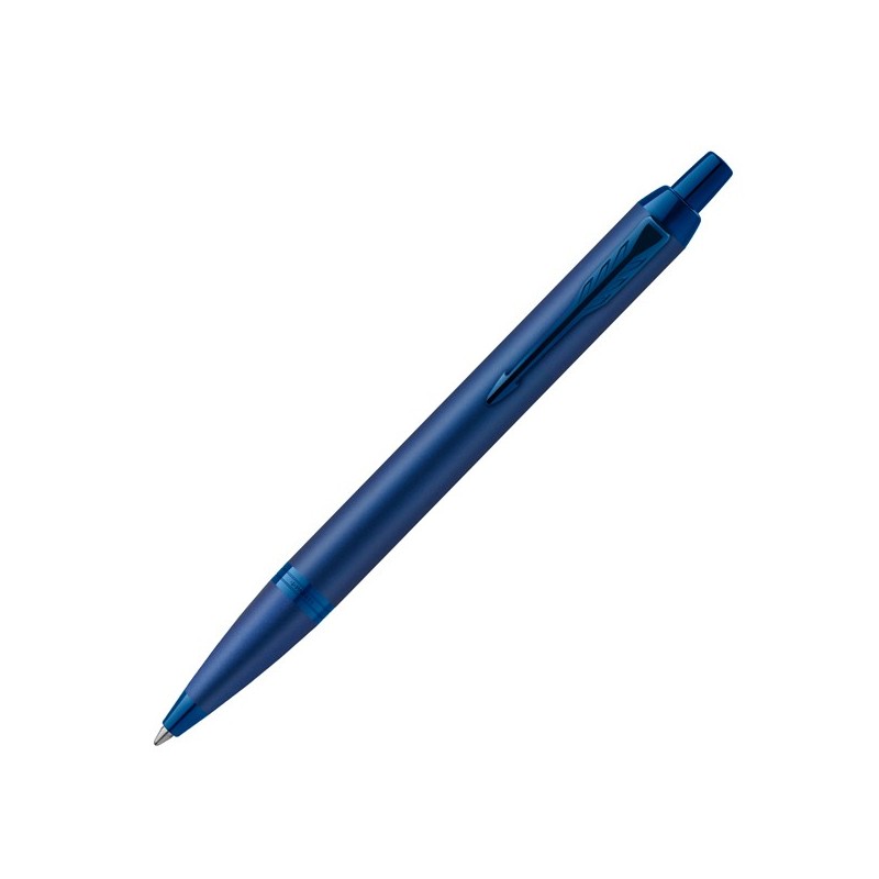 Penna Parker in acciaio inossidabile con finiture mattate blu e completata con finiture cromate. Confezionata in elegante astuccio regalo. Fornita con refill colore blu.